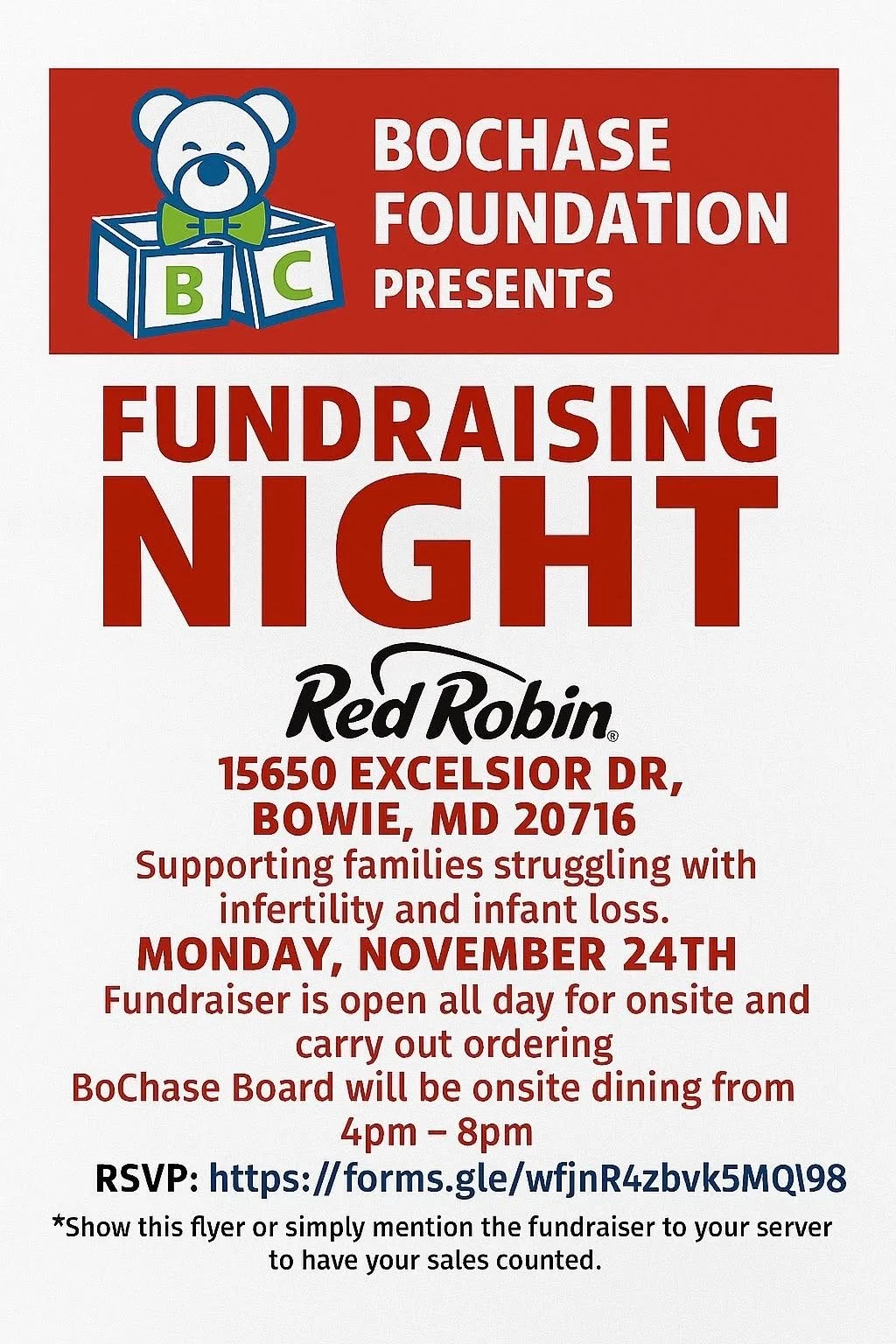 We invite you to join the BoChase Foundation for a special Fundraising Night at Red Robin in Bowie, Maryland — an evening dedicated to supporting families struggling with infertility and pregnancy/infant loss.